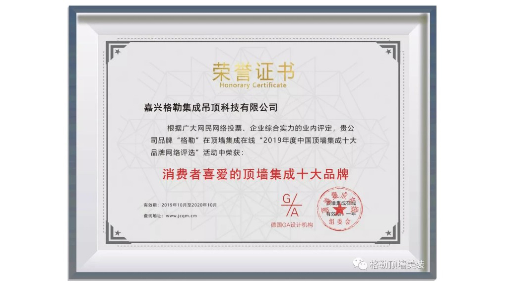 喜报|热烈祝贺格勒顶墙美装荣获2020年度“集成吊顶十大品牌”
