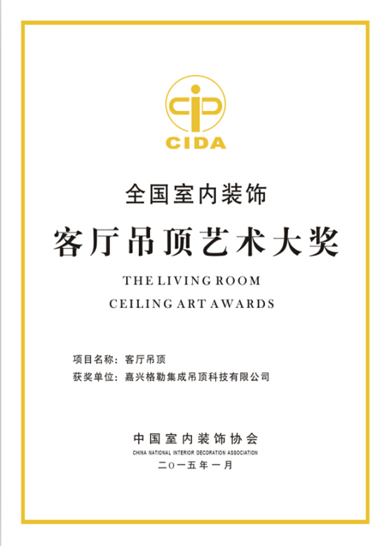 伴随着羊年的钟声,希冀与荣誉相携而来。继“产品创新奖”、“2014年集成吊顶最具行业影响力十大品牌”之后,格勒再度获评中国室内装饰协会颁发的“全国室内装饰客厅吊顶艺术大奖”。中国室内装饰协会是1988年9月成立的经政府批准组建的室内装饰行业全国性组织。如此权威机构对格勒客厅吊顶的认可是格勒全屋吊顶向纵深方向上推进的莫大动力。