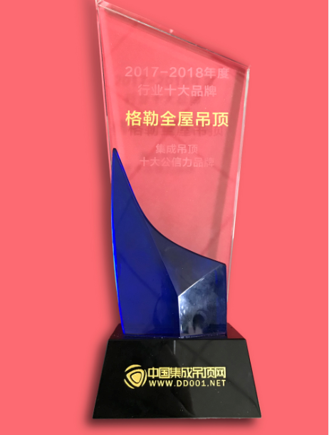 助力品牌强国战略,打造更多享誉世界的“中国品牌”,推动中国经济发展进入质量时代,2017年10月25日,集成吊顶行业大佬齐聚嘉兴晶晖酒店,颁奖典礼上,格勒全屋吊顶凭借优质的产品、专业的精英团队和卓越的行业贡献等多个维度的综合实力,在层层选拔中脱颖而出,荣膺“集成吊顶十大公信力品牌”。