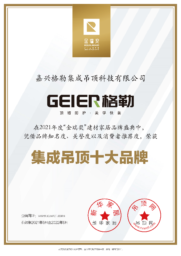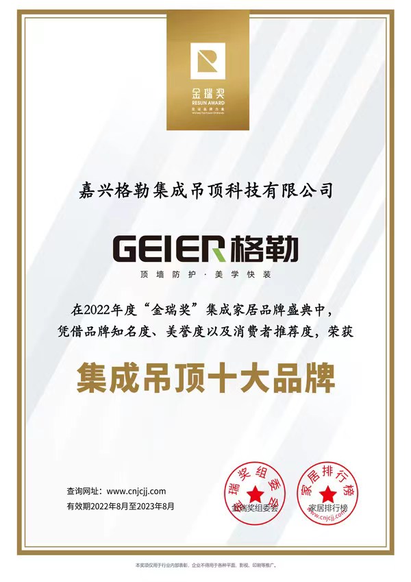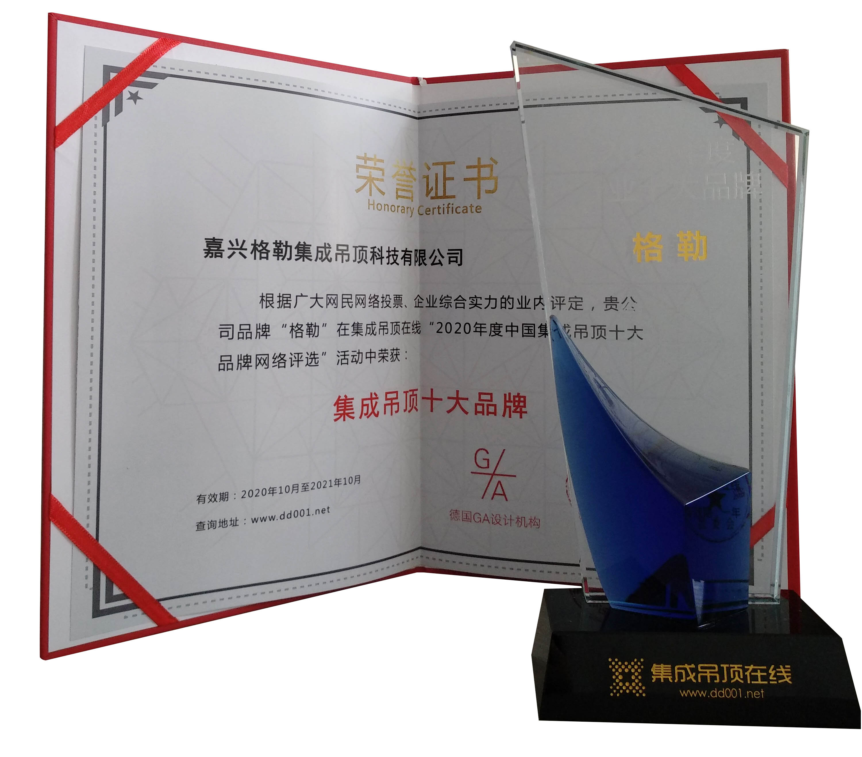(格勒“2022年度集成吊顶十大品牌”证书)