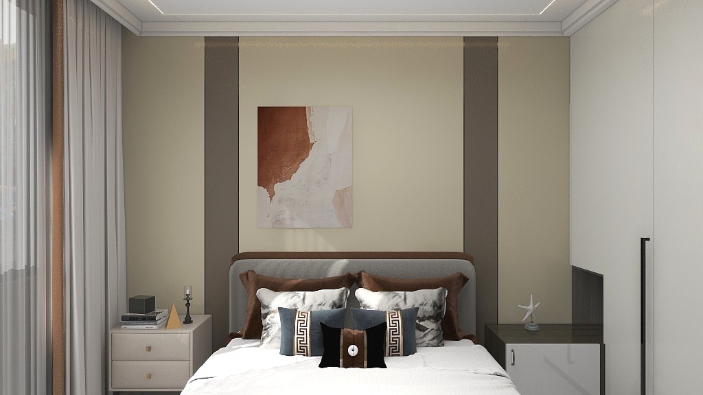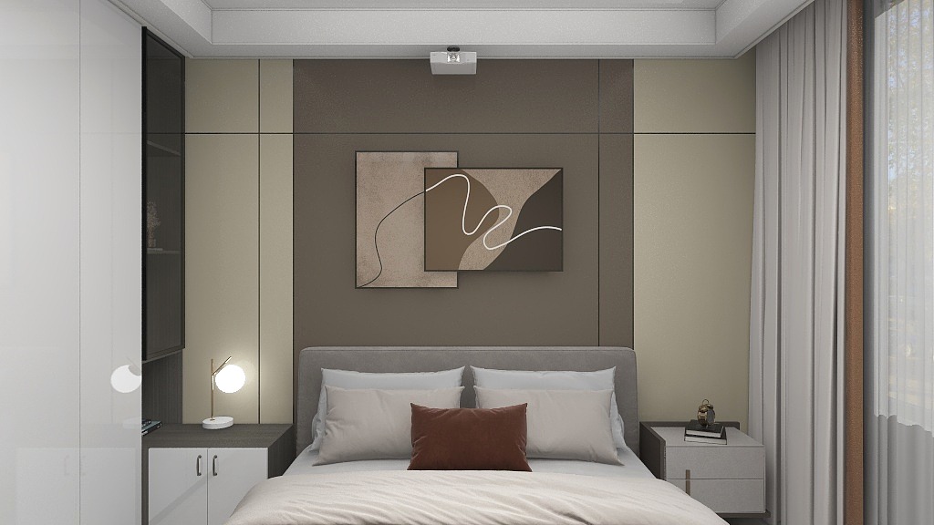 主卧背景墙也可以用硅藻纤维墙板配上黑色线条,从而打造出富有层次感的背景墙!