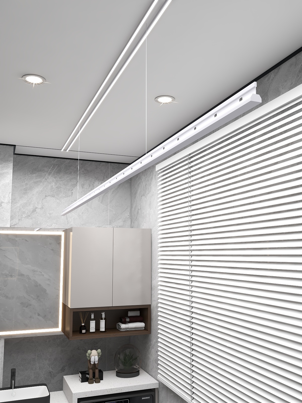 隐藏式晾衣机能完美融入吊顶内,不用时自动收进吊顶,收放自如。
